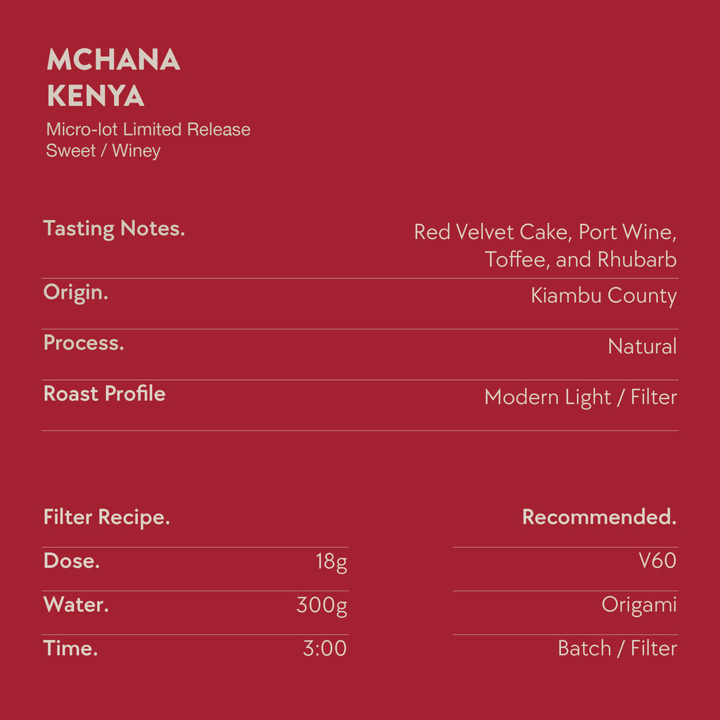 Kenya, known for their incredible washed coffees that are rich, juicy, and full of flavour. We wanted to bring something different, a naturally processed coffee from those not known for it. This unconventional coffee has extremely deep flavours for a filter roast, and makes us feel like we're eating cake next to a fire in a snowy winter.